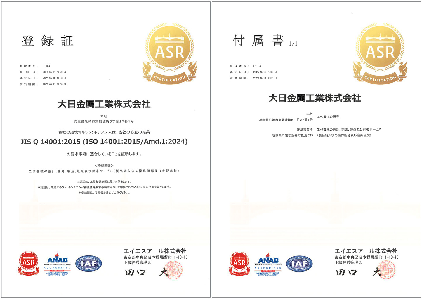 大日金属工業株式会社は、お客様に『より良い製品・サービス』を、『地球環境に配慮』しながらご提供することが私たちの使命と考え、品質面と環境面の双方で私たち自身がポリシーを持ち、生産活動を行っています。